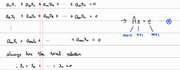 · 만약, Non-trivial solution 이 존재하나다면 rank(A) < n 인 조건이 필요